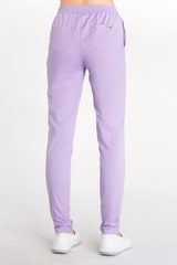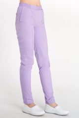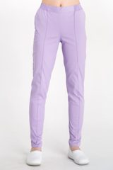 Брюки женские, слегка зауженные к низу, на притачном поясе с эластичной тесьмой, вставкой по середине. По центру передних половинок стрелки зафиксированные строчкой, боковые карманы от талии до бокового шва под наклоном. На задних половинках накладные карманы, с металлической металлофурнитурой