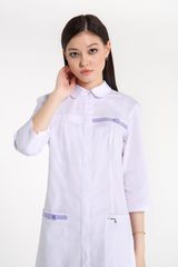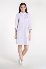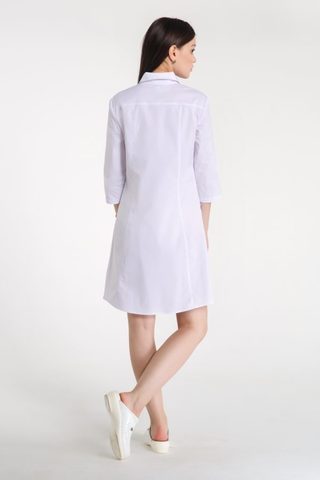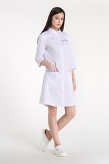 Халат женский, укороченный, полуприлегающего силуэта с потайной застежкой. Воротник на отрезной стойке с закругленными концами, застежкой на кнопку по центру. Два накладных кармана, рукав 3/4.